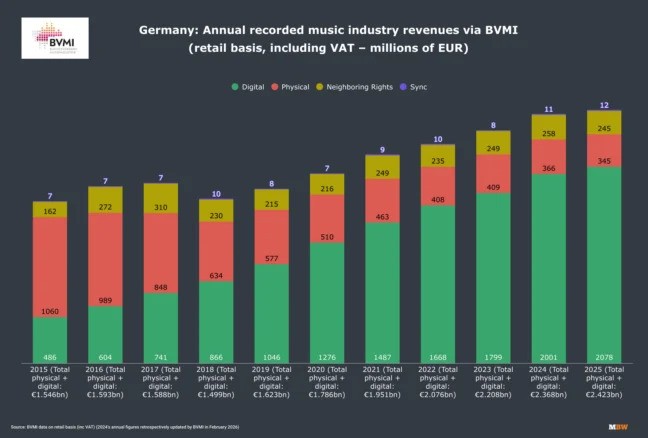 The German Music Industry Association (BVMI) has shared a growth of 2.3% YoY in 2025 for recorded music, marking a notable slowdown.