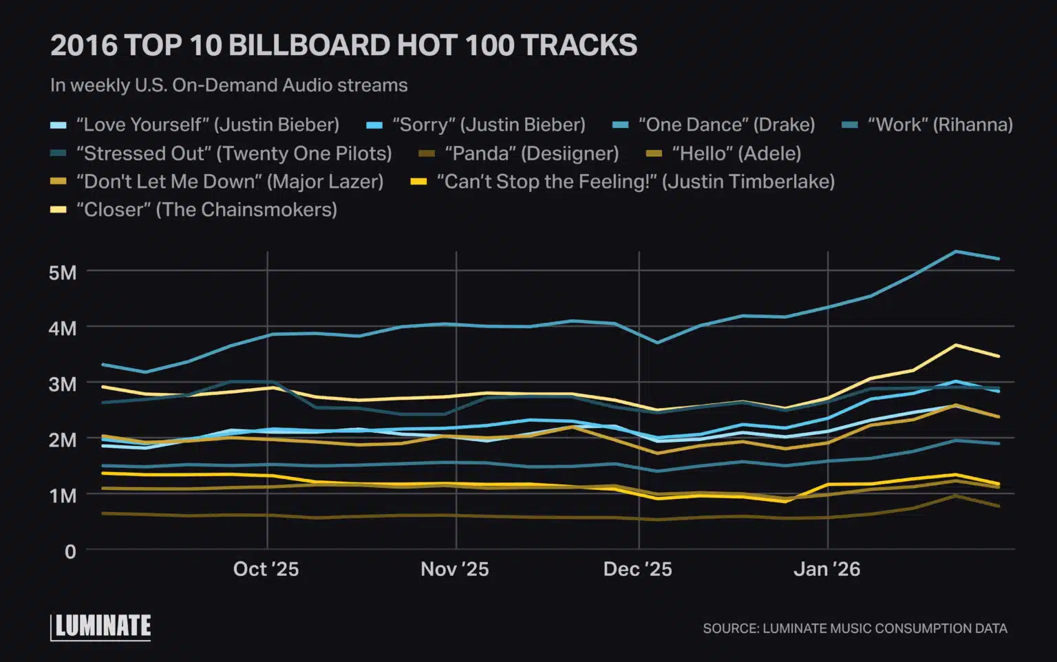 Luminate’s findings show that the trend helped boost the streams from 2016’s Top 10 Billboard Hot 100 tracks, looking at the streaming activity between the end of 2025 and mid-January.