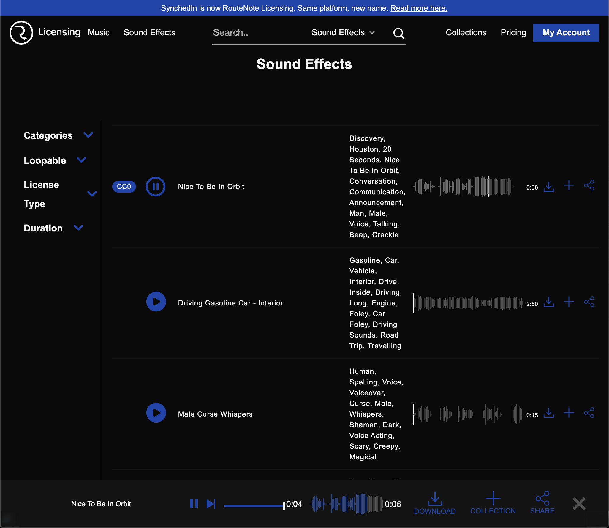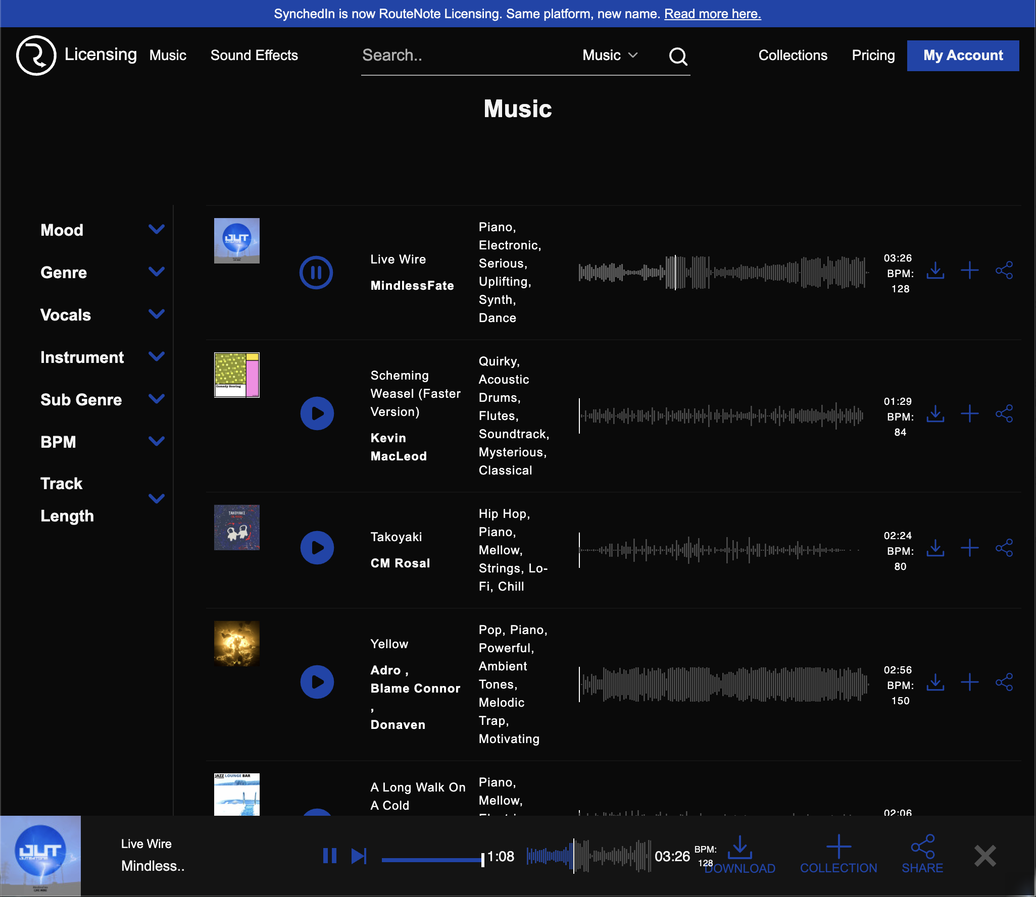 Start by signing up for a free account at licensing.routenote.com. Although part of the RouteNote family, you’ll need to create a separate account, unless you previously had a SynchedIn account. Once you sign in, you’ll immediately be greeted by collections. If you see something you like, dive right on in. If you’re looking for something more specific, use the search bar at the top. If you’d rather browse for that perfect sound, use the Music, Sound Effects, or Collections links in the top bar.