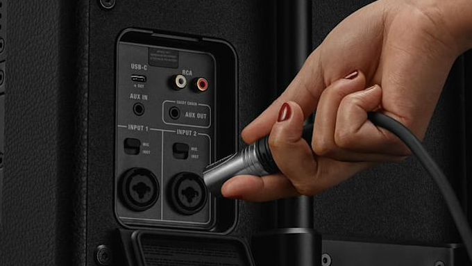 Along the top of the front of the speaker, you’ll find the control panel, with buttons including power, audio source, media control and light mode, plus knobs for volume, bass, treble, input 1 volume, input 2 volume, effects, and sound character, as well as a battery indicator. The sound character control lets you toggle between dynamic or loud, for clarity or punchiness respectively. Dynamic is suited to smaller, indoor settings, while loud is more suited to outdoor spaces.