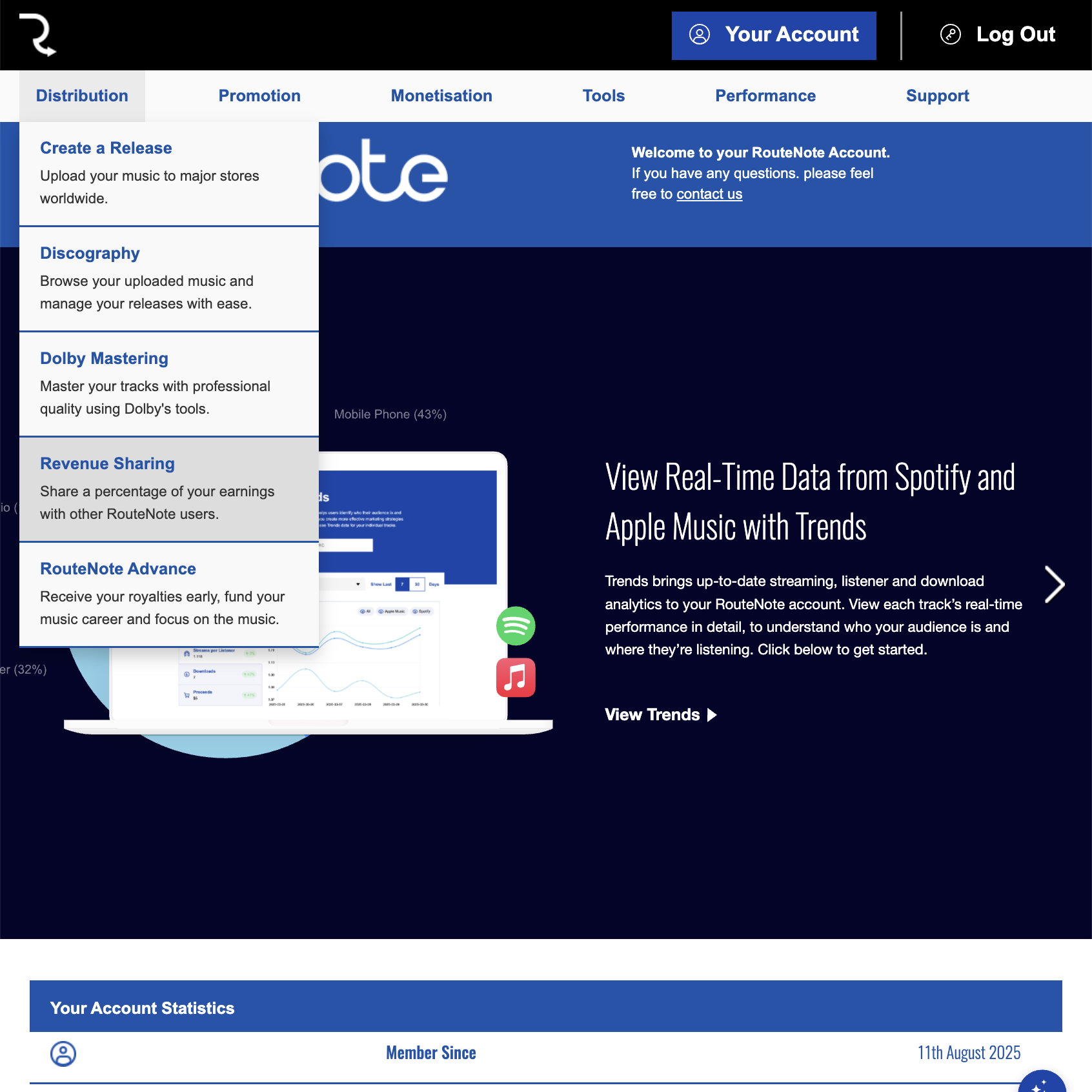 - Login to RouteNote, hover over the Distribution tab and click Revenue Sharing