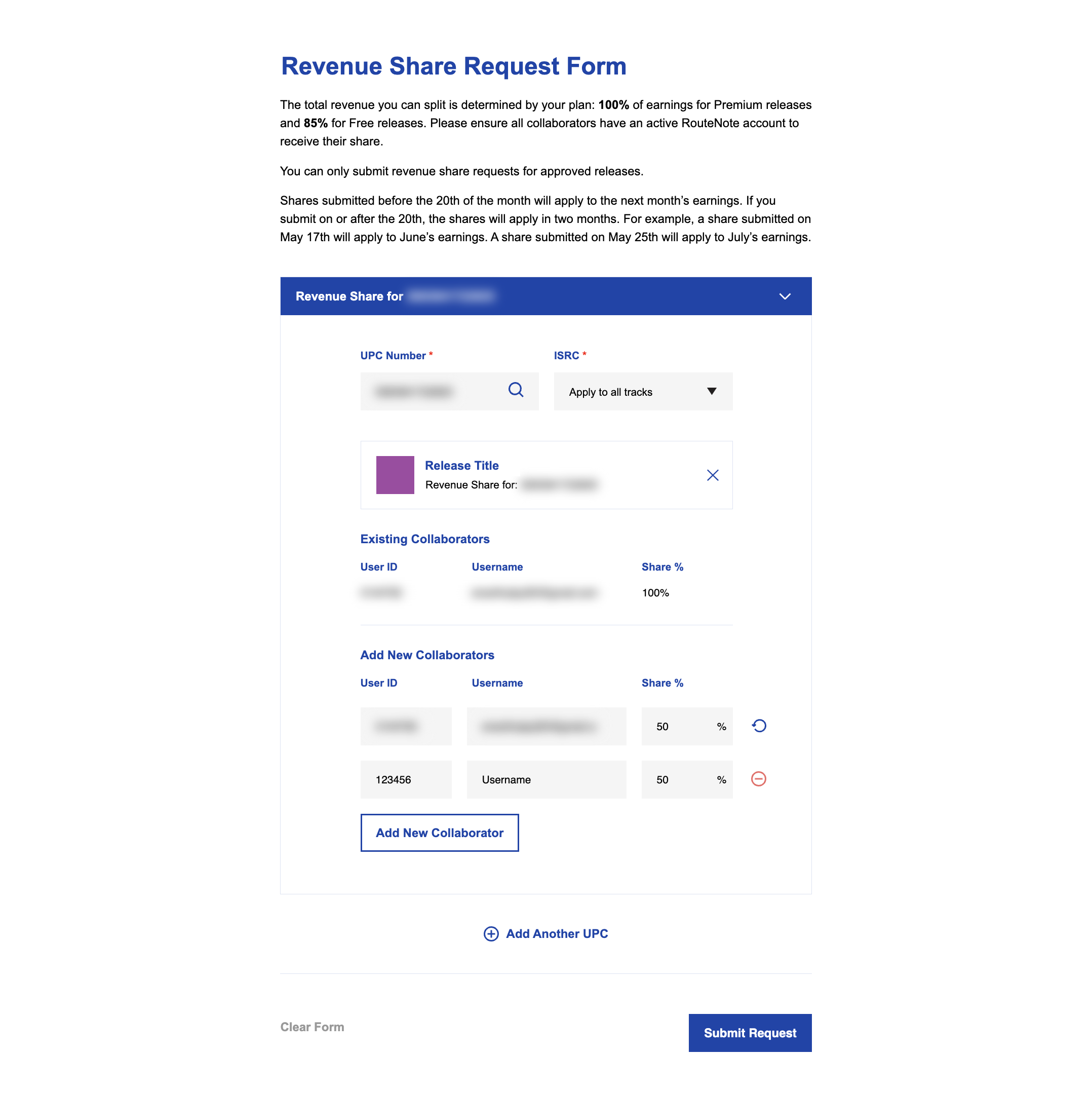 Enter a specific ISRC to split the royalties of a single track or click Apply to all tracks to share the revenue on the whole release. You can add as many collaborators as you like to a single release, just remember, RouteNote’s 15% cut applies to all releases distributed via our Free model. Choose RouteNote Premium to keep 100%. Use Add Another UPC to submit multiple UPCs in one request.