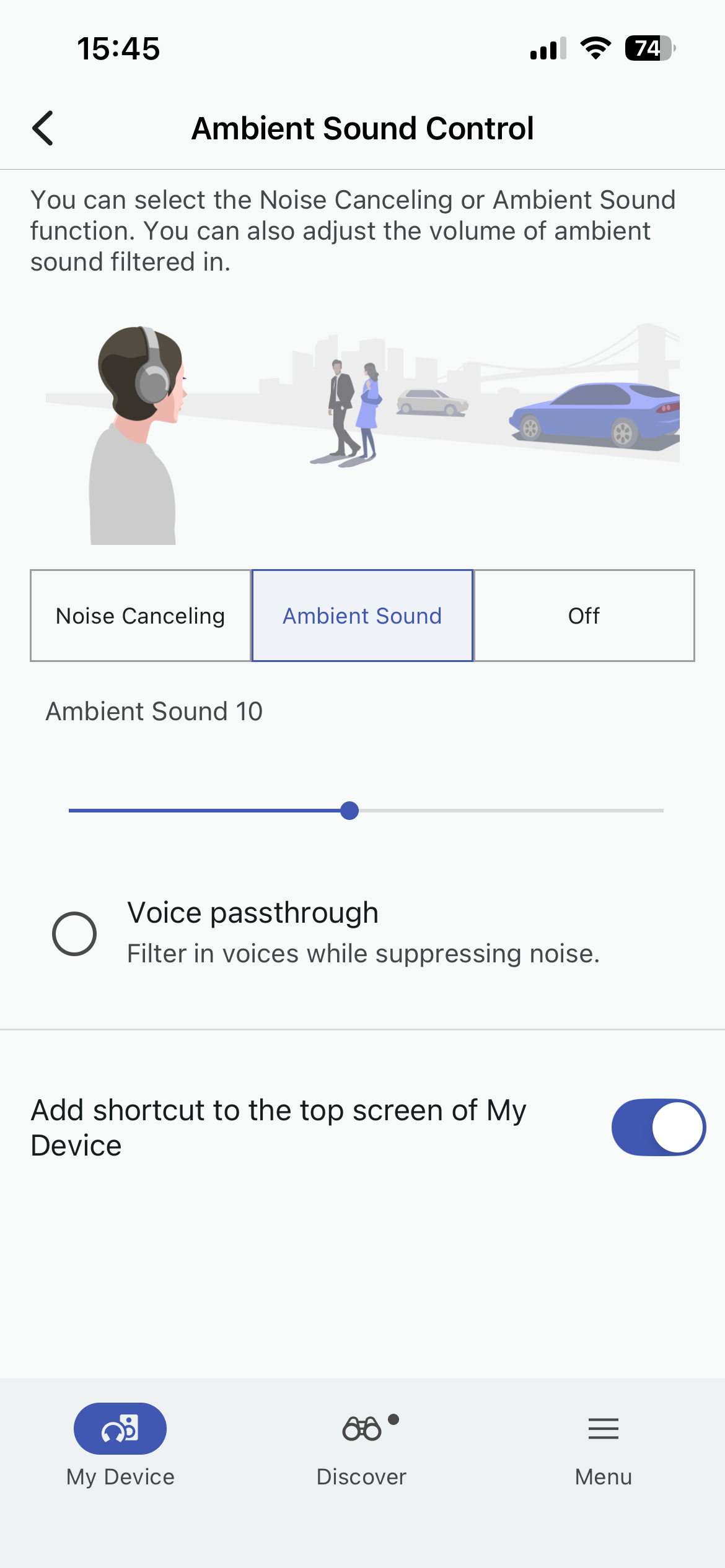 Ambient sounds mode uses the dual microphones to pick up surroundings and help you stay aware of your environment. In the app, you can dial in noise canceling between 1 and 20. Additionally, ‘Voice passthrough’ mode filters in voices. The feature is okay to use when necessary, but at full whack (level 20) sounds a little too amplified and unnatural.
