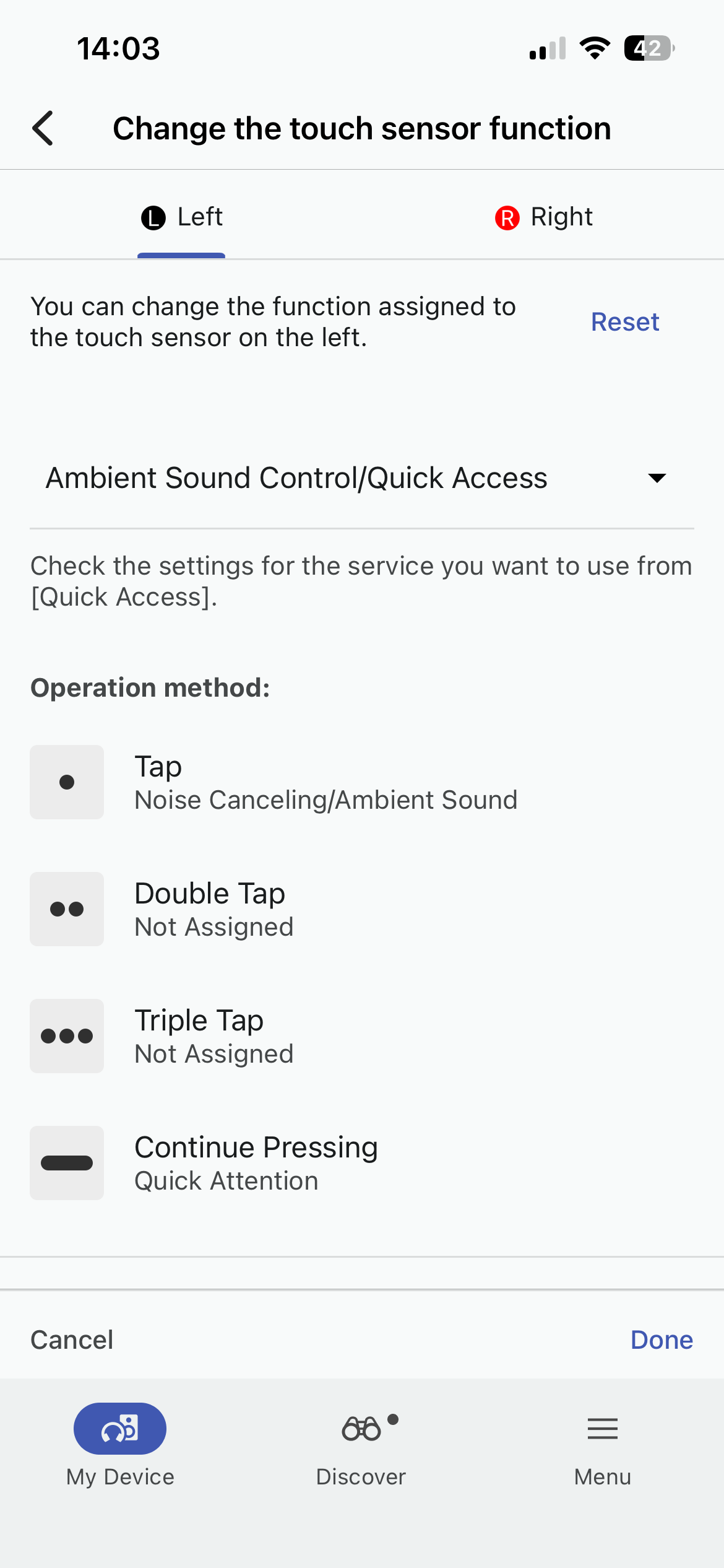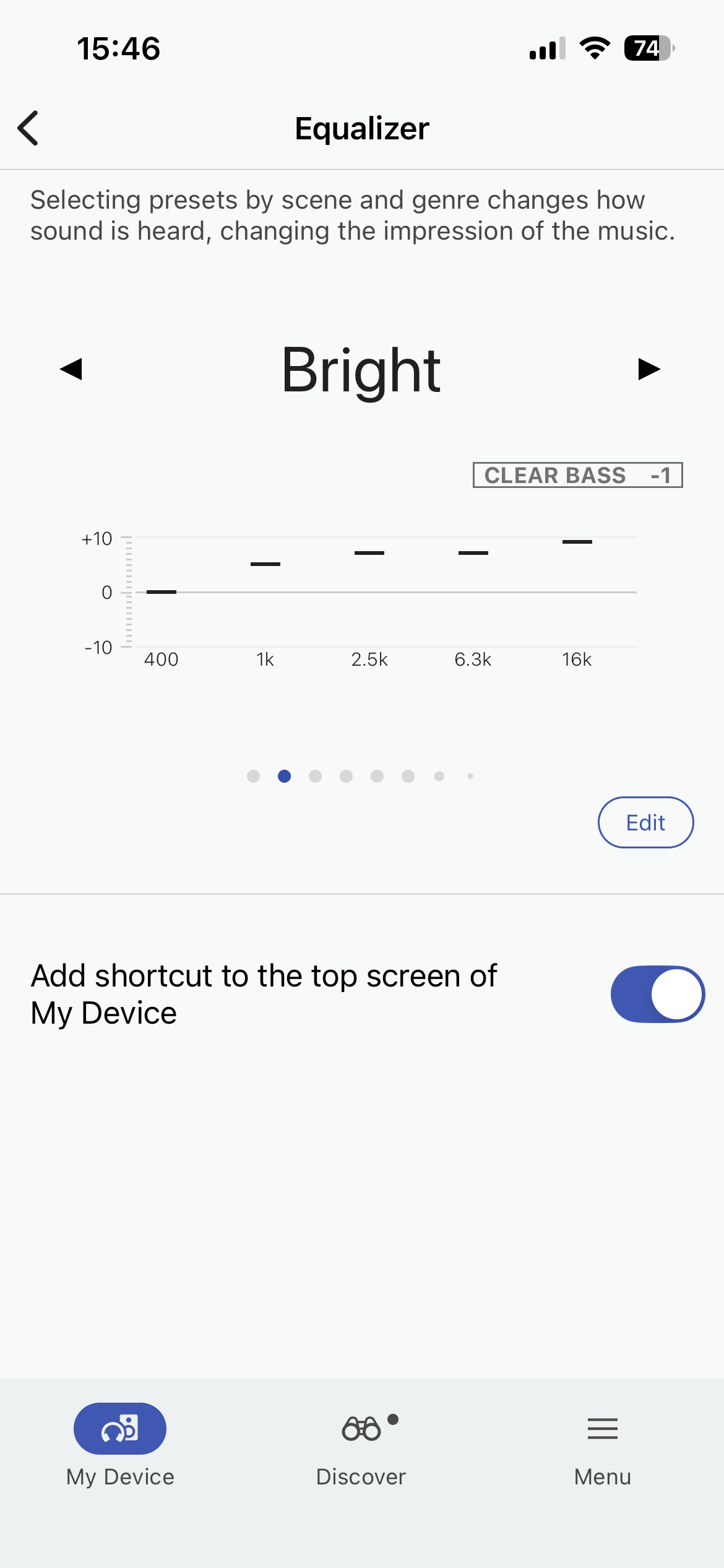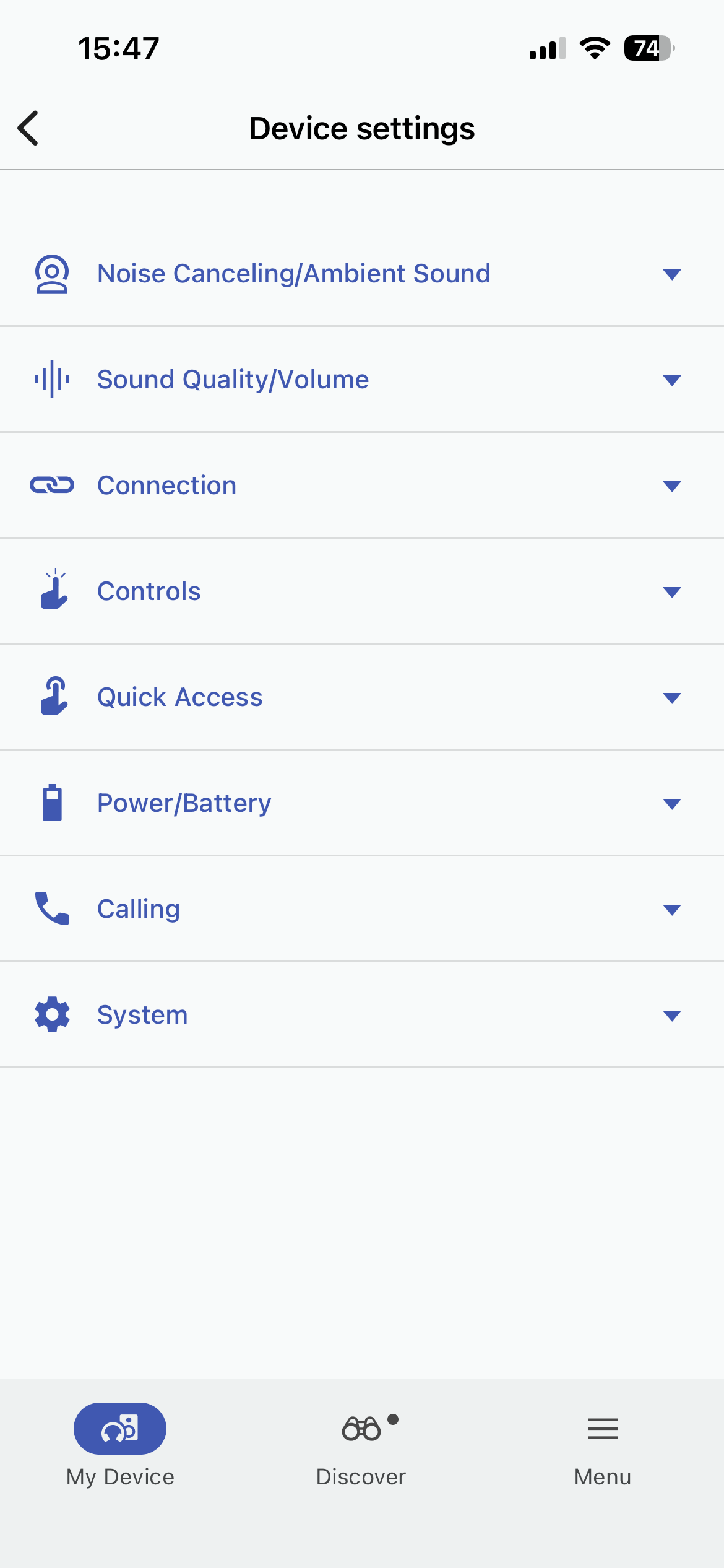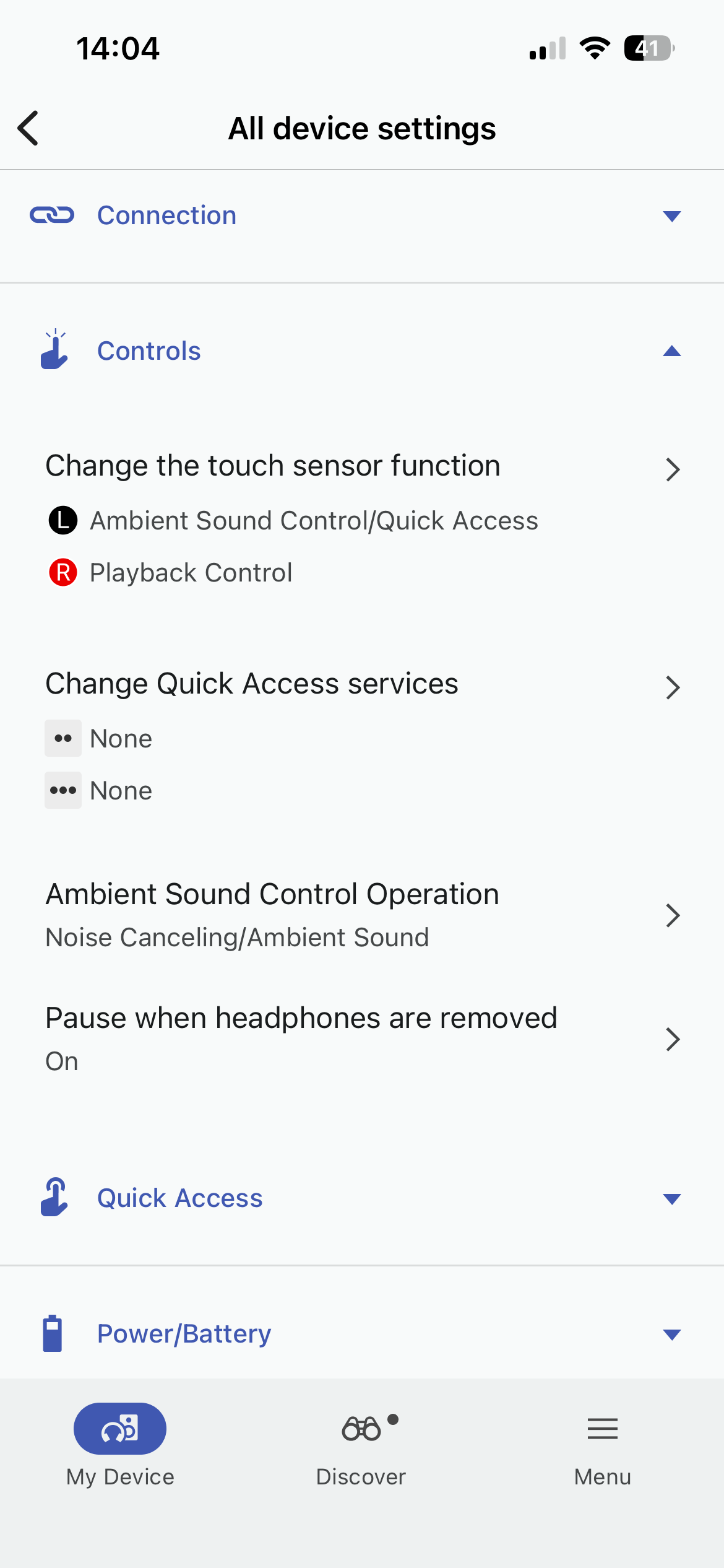 ‘Adaptive Sound Control’ is followed by multipoint controls and ‘Bluetooth Connection Quality’, which lets you switch between a prioritization on sound quality or a stable connection. The rest of the controls are buried away under ‘Device settings’, including Find Your Equalizer, DSEE, 360 Reality Audio Setup, Quick Access setup, touch controls customization, auto play/pause/power settings, and more.