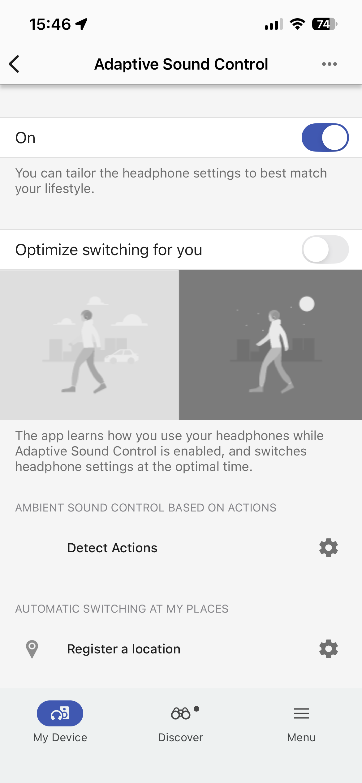 Once fully up and running, the top of the app displays the battery percentage of each bud and the case. Next up is the ‘Ambient Sound Control’ (more on that later) and the equalizer. There are dozens of presets or a custom 5-band EQ to dial in the exact sound you’re after. There’s ‘Adaptive Sound Control’, which switches listening modes automatically, based on your actions and location.