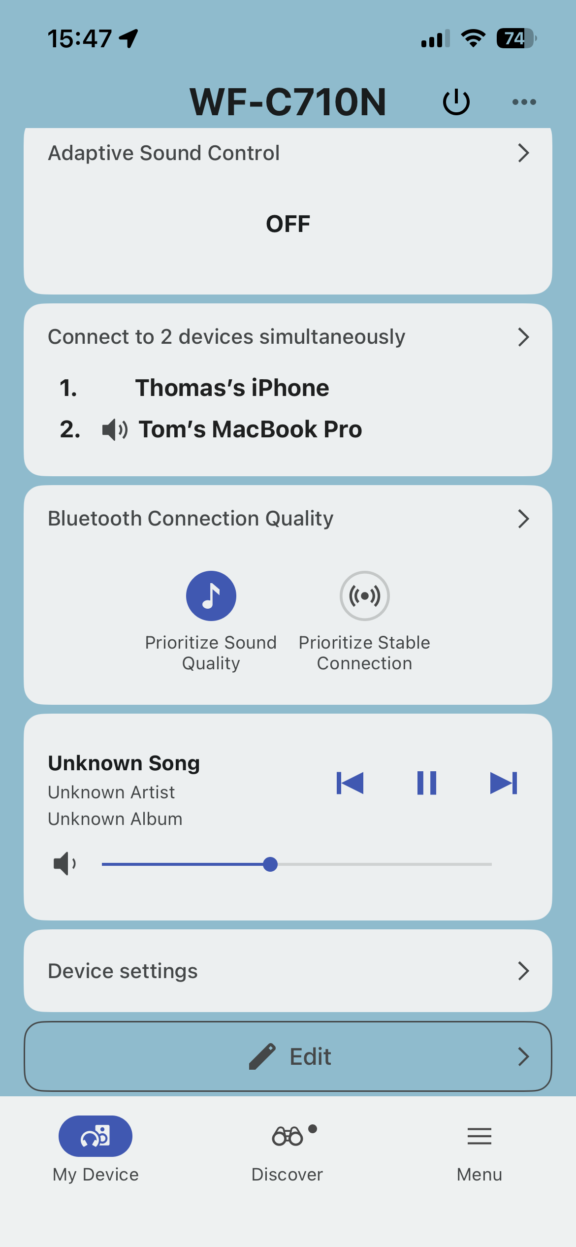 The WF-C710N were quick to pair and setup with both my iPhone and MacBook. They use Bluetooth 5.3 and support a bunch of smart features to ease connection, including Multipoint Connection. I paired to my second device via Sony’s Sound Connect app, which put the earbuds back into pairing mode and connected with my laptop right away as expected. With Multipoint, the earbuds automatically switch to the device actively playing media. Each earbud is independently connected to your device, which means you can use either one earbud on its own.