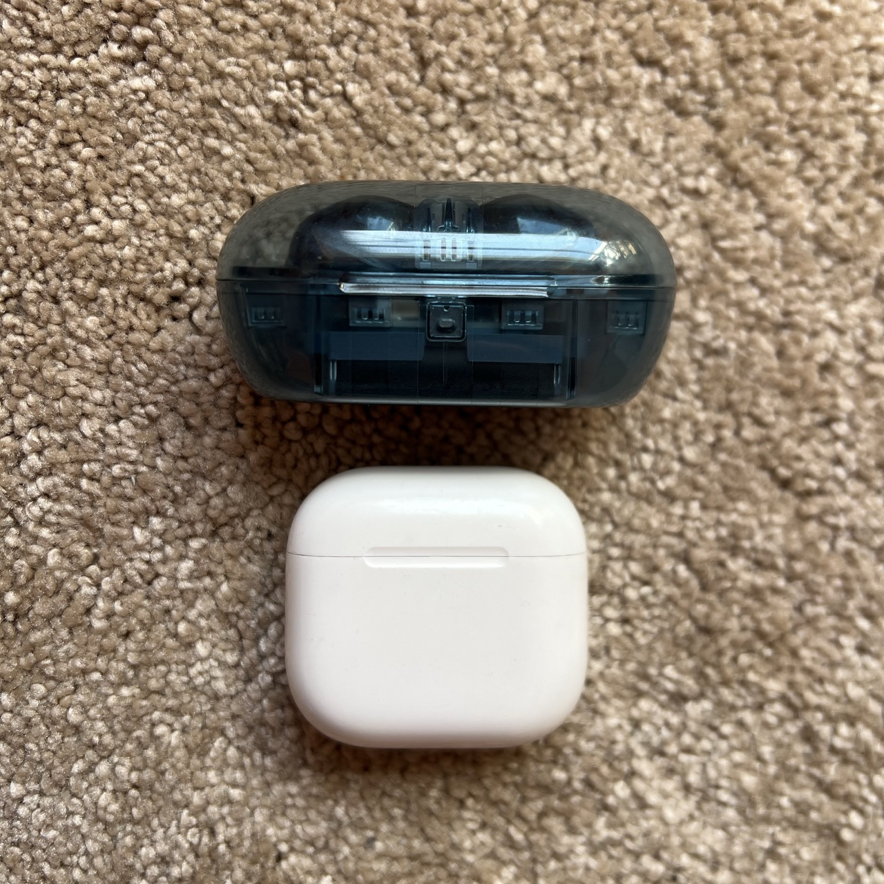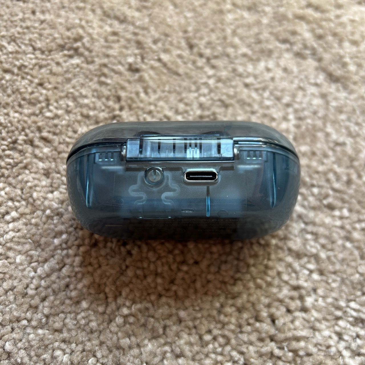 The color-matched charging case has a USB-C port and Bluetooth pairing button on the back. The case is significantly larger than my AirPods 4 case in two dimensions, but its cylindrical pill shape and light weight form factor enables the case to be slipped discreetly into a pocket alongside a wallet or phone.