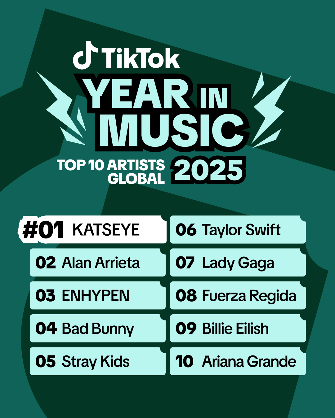TikTok crowned KATSEYE as its Global Artist of the year for 2025. Popular with fans around the world, the Los Angeles girl group had multiple viral moments on TikTok this year through tracks like Gnarly and Gabriela. In total, the group racked up over 30 billion views and 12 million creations using their music in 2025.
