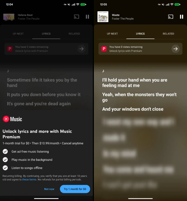 Lyrics on YouTube Music haven’t changed much since the feature first launched, aside from real-time syncing and more shareable lyric graphics. Now, the platform looks to be making unlimited access to lyrics a subscriber-only feature.