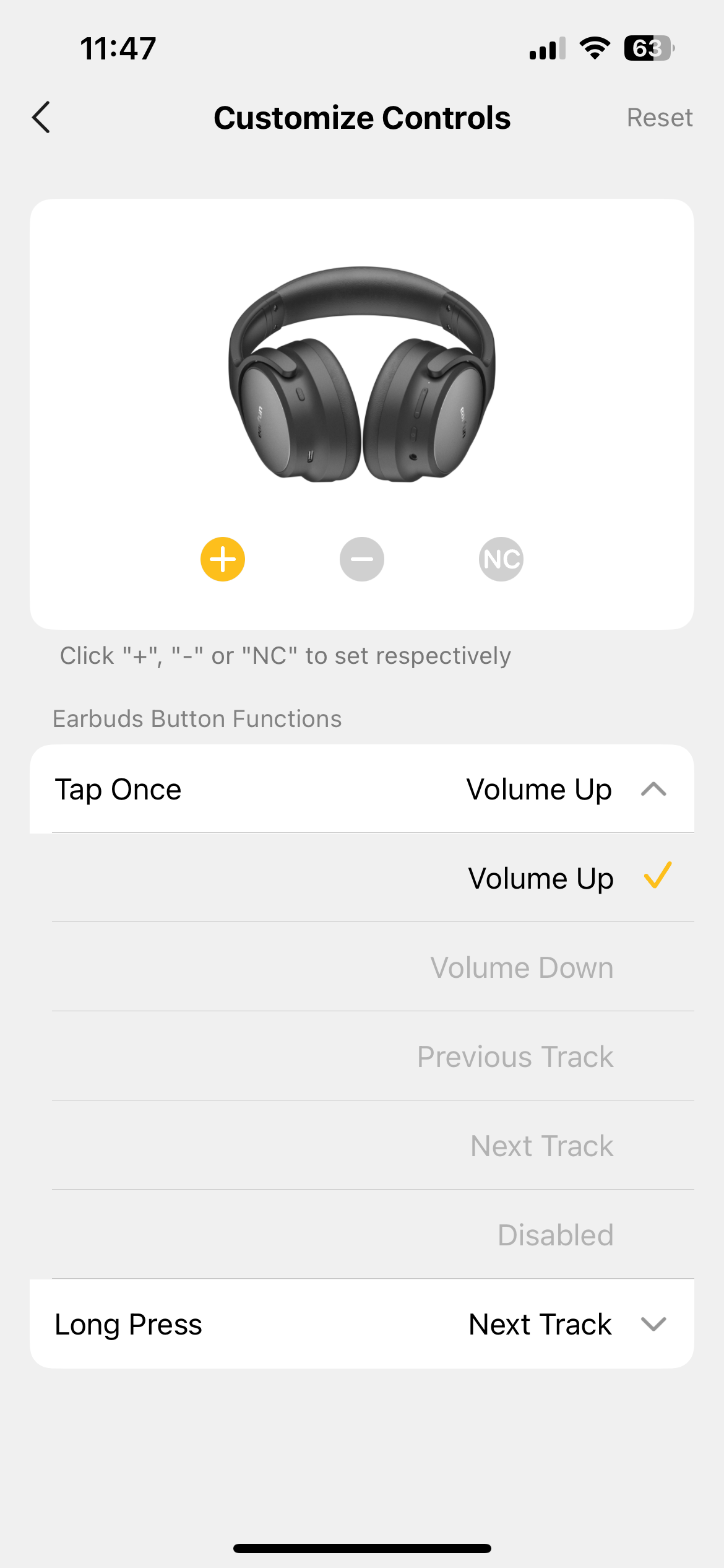 Como ya se ha mencionado, hay controles físicos en la parte inferior de los auriculares. Además de encender y apagar los auriculares, un solo toque en el botón de encendido permite reproducir/pausar/responder/finalizar llamadas. Una pulsación larga o varias pulsaciones rechazan llamadas, las transfieren o activan el asistente de voz. También hay botones para subir y bajar el volumen, y un botón ANC que alterna entre Normal, Sonido ambiente y ANC fuerte. Al pulsar prolongadamente estos botones se pueden personalizar las funciones, como reproducción/pausa, subir volumen, bajar volumen, pista siguiente, pista anterior, asistente de voz, cancelación de ruido, rellamada, modo de juego y conexión de dos dispositivos.