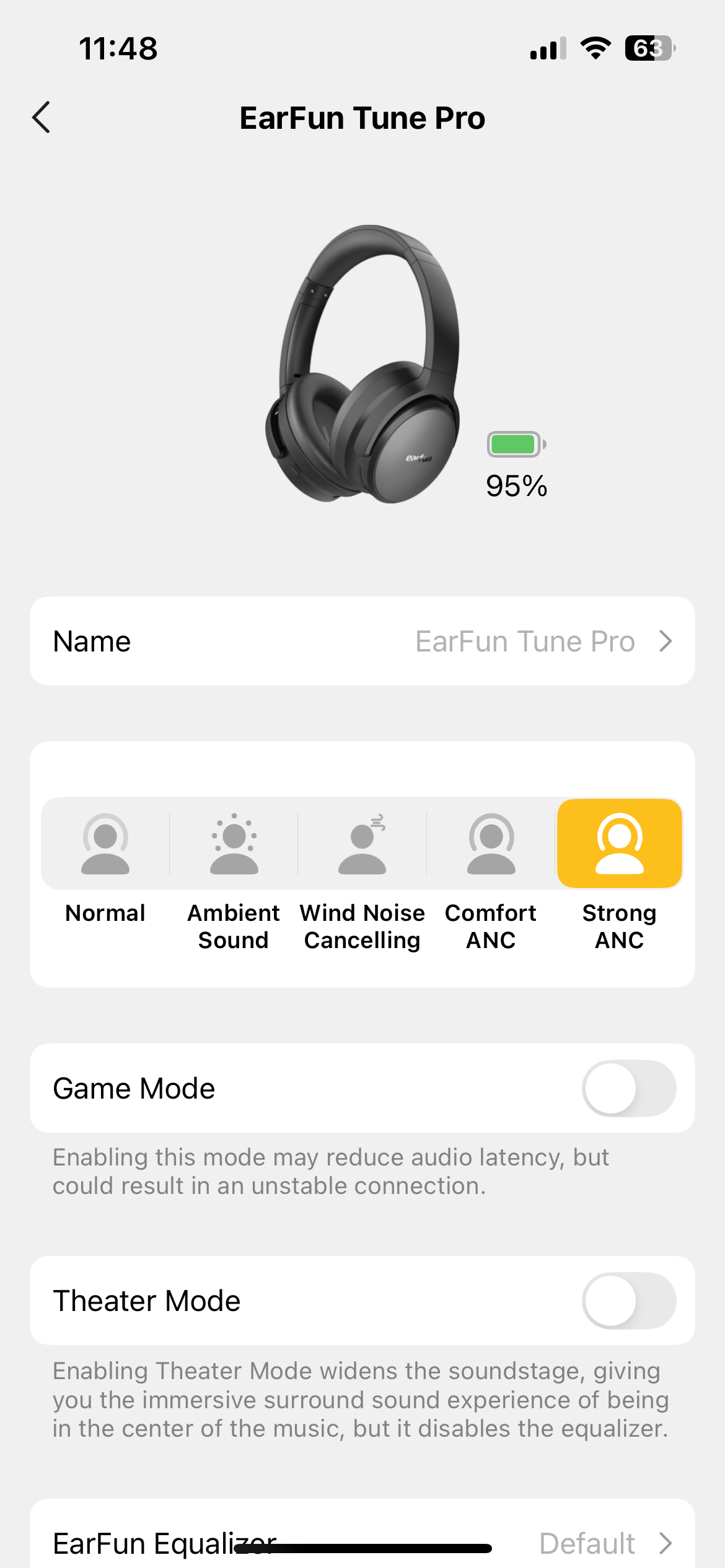 La aplicación EarFun Audio no es necesaria para escuchar, pero ofrece funciones adicionales. Al abrir la aplicación, los auriculares se reconocen de inmediato. La parte superior de la aplicación muestra el estado de la batería. A continuación aparece el conmutador de cancelación de ruido con cinco niveles: Normal (desactivado), Ambient Sound, Wind Noise Cancelling, Comfort ANC y Strong ANC. También puedes activar el Game Mode para una baja latencia, un nuevo Theater Mode para un escenario sonoro más amplio, personalizar los controles, desactivar la carga de audio USB para consumir menos energía del dispositivo cuando se utiliza audio USB, configurar la conexión multipunto, actualizar el firmware y controlar otros ajustes del dispositivo.