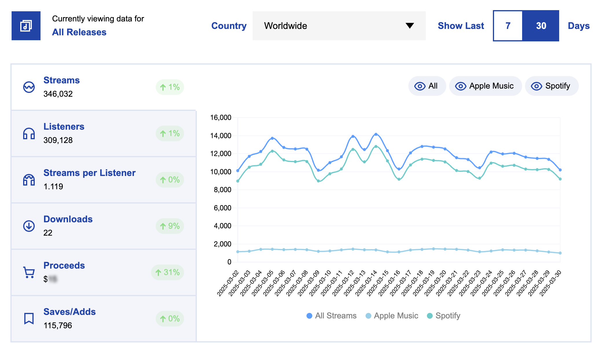 Por defecto, la página Tendencias muestra todos los datos de tus lanzamientos, en todo el mundo, de los últimos 7 o 30 días, en Spotify y Apple (Apple Music e iTunes). Con la barra de búsqueda y varios botones, puedes desglosar fácilmente estos datos por canción, país y plataforma.