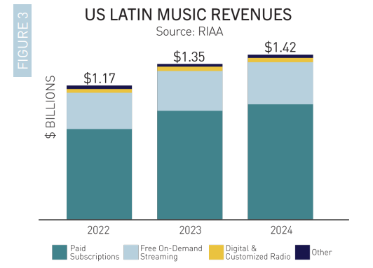 El streaming siguió siendo la fuente dominante de ingresos para la música latina, aportando casi 1.400 millones de dólares a los ingresos totales. Las suscripciones de pago desempeñaron un papel importante, generando 966,5 millones de dólares, un 6,1% más que en 2023. El streaming a la carta con publicidad también experimentó un crecimiento, aportando 354 millones de dólares, un 5,8% más que en 2023. Sin embargo, los ingresos procedentes de las distribuciones de SoundExchange experimentaron un ligero descenso del 0,8%, totalizando 45,6 millones de dólares, mientras que otros ingresos por streaming con publicidad disminuyeron un 6%, hasta 29,2 millones de dólares.