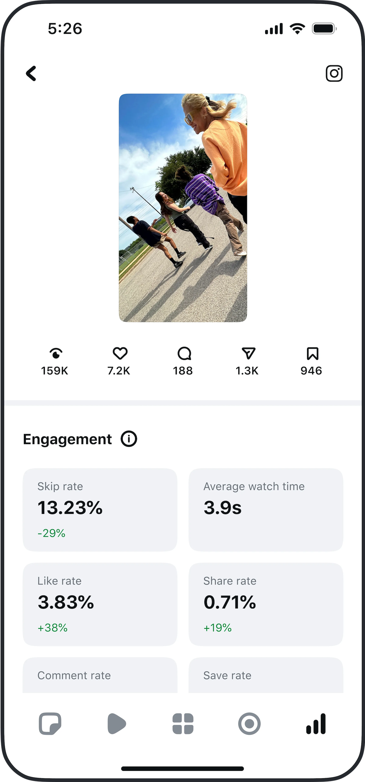 La última página de Edits es «Insights». Muestra tus estadísticas de Instagram para que puedas analizar lo que funciona y lo que debes probar a continuación. Hay un resumen de las «Reels views», «Reach», «Net followers», «Likes», «Comments», “Shares” y «Saves» de tu canal, con la opción de ver los datos de los últimos 7, 14, 30 o 60 días. Toca una de estas estadísticas para ver un gráfico, de modo que puedas ver dónde están los picos de tu actividad. A continuación, obtendrás una lista de tus vídeos ordenados por fecha de subida o número de visualizaciones. Esto puede basarse en todo el tiempo, o en los últimos 7, 14, 30 o 365 días. Toca uno de los vídeos para ver análisis detallados sobre esa publicación, como «Tasa de omisiones», «Tiempo medio de visionado», «Tasa de me gusta», «Tasa de compartidos», «Tasa de comentarios», «Tasa de guardados», así como la proporción de visionados por seguidores y no seguidores, las fuentes de los visionados y un gráfico de retención.